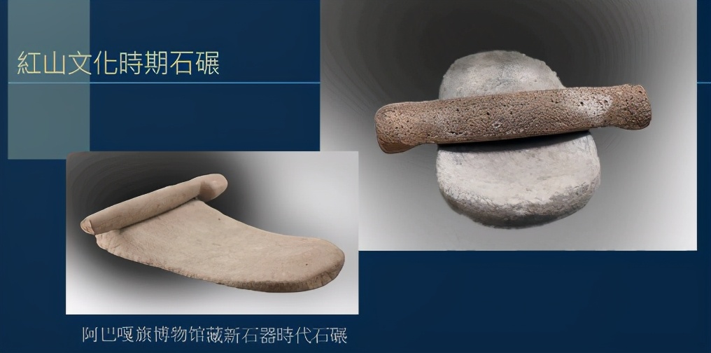 这是赤峰博物馆藏红山文化时期的石碾,六七千年了,下面的石板有点下凹,可以容纳较多、较大的东西。