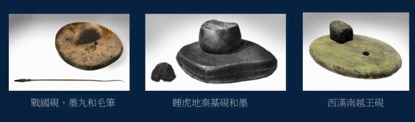 中间这个是睡虎地秦墓出土的,墓主是秦小学吏,名「喜」。右边是西汉时南越王用的砚,墓中出土的墨丸多达四千三百多。像这样使用研石的,都是用墨丸的。
