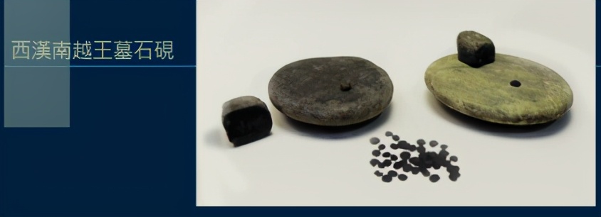 中间这个是睡虎地秦墓出土的,墓主是秦小学吏,名「喜」。右边是西汉时南越王用的砚,墓中出土的墨丸多达四千三百多。像这样使用研石的,都是用墨丸的。