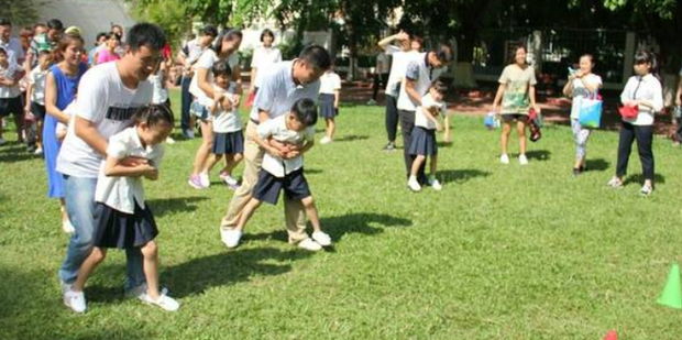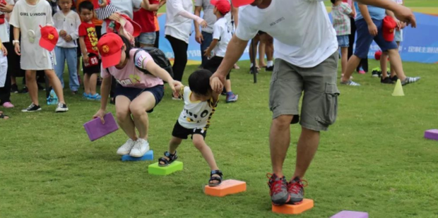 游戏方法:孩子的脚踩在家长的脚上,两过障碍后返回起点,比谁快。