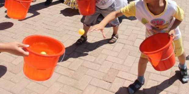 游2米线后,孩子依次将10个小球投向桶内,家长可以移动接球,比比哪组接球数最多。