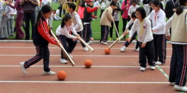 游戏方法:家长和孩子各自站在相对的两头,孩子拿着羽毛球拍把皮球赶到家长那里;家长拿着羽毛球拍把皮球赶到呼啦圈,游戏就结束。以先完成的队为胜。