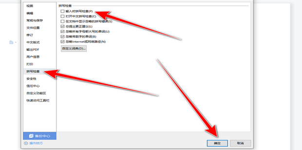 3:最后点击拼写检查,取消勾选输入时拼写检查,点击确定即可。
