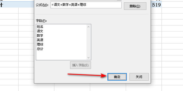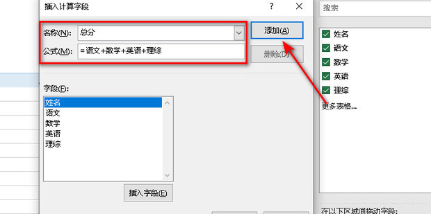 来自4:名称框内输入总分,公式框内输入=语文+数学+英语+理综,然后点击添加。