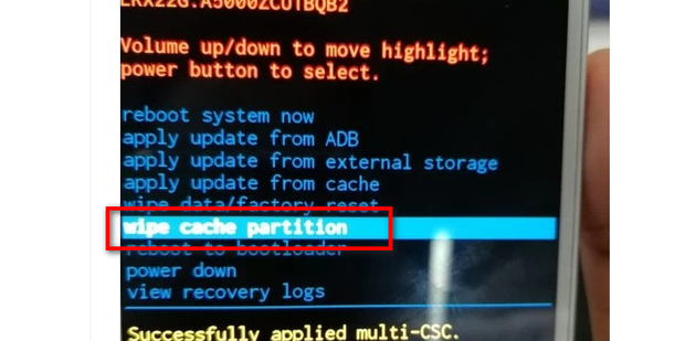 4:上述操作完成后,系统会回到recovery界面,继续按音量下键选择wipe cache partition,按电源键确认。