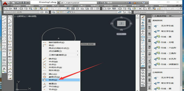 5:将鼠标移至另一个圆,shift键不要松开,来自右键单击,在弹出的菜单中点击切点