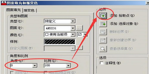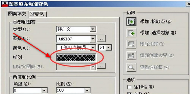 4:在返回的图案填充和渐变色中我们设置比例,然后我们点击边界下的拾取点。