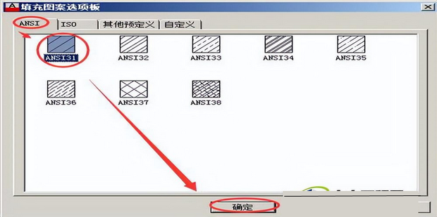 3:区步在弹出的图案选项板中我们选择anst--anst31号图案。选择后点击确定
