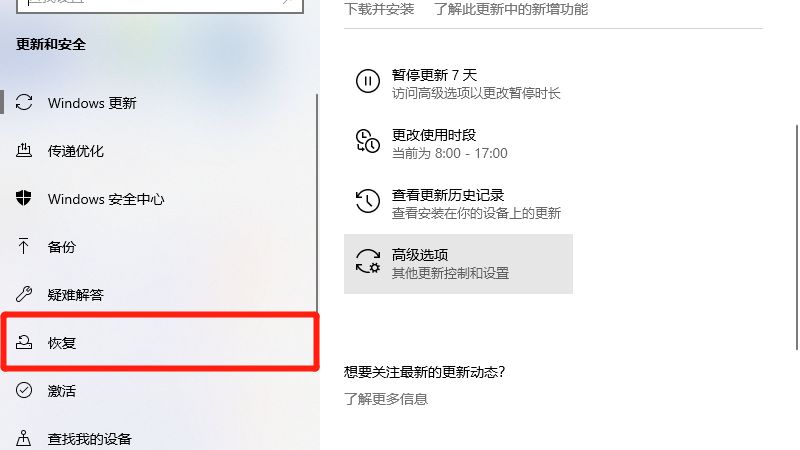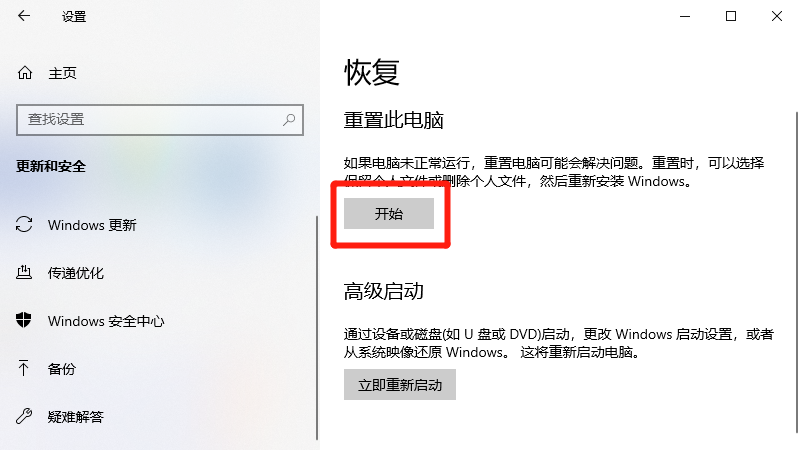 在展开的恢复选项中,点击开始即可。
