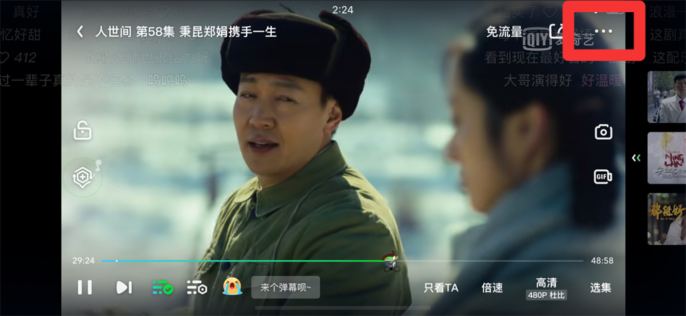 在爱奇艺全屏播放界面中,点击右上角三点。
