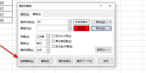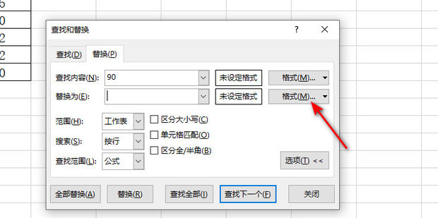 4:查找内容框内输入90,然后将鼠标放在替换为内容框中并点击选项。
