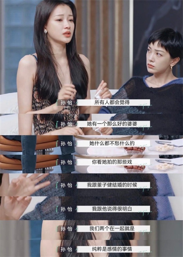 同年11月,恢复单身的孙怡在《再见爱人》综艺亮相,在看到嘉宾夫妻因撒谎发生争执时,她脱口而出:“这个世界上,根本没有不撒谎的男人”。