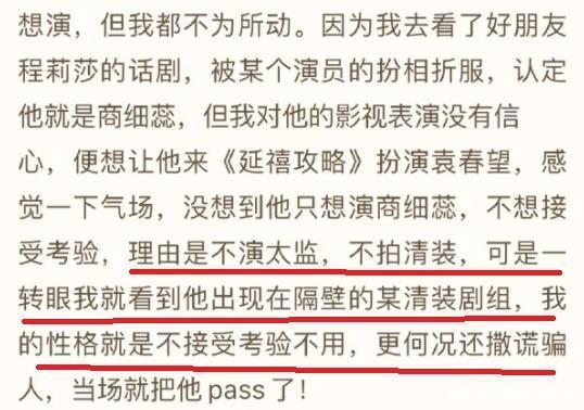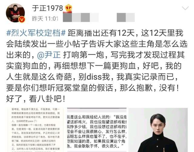 于正发了一篇“选角内幕”小作文,暗指某小生对角色挑三拣四,态度不端,言而无信,被他弃用。