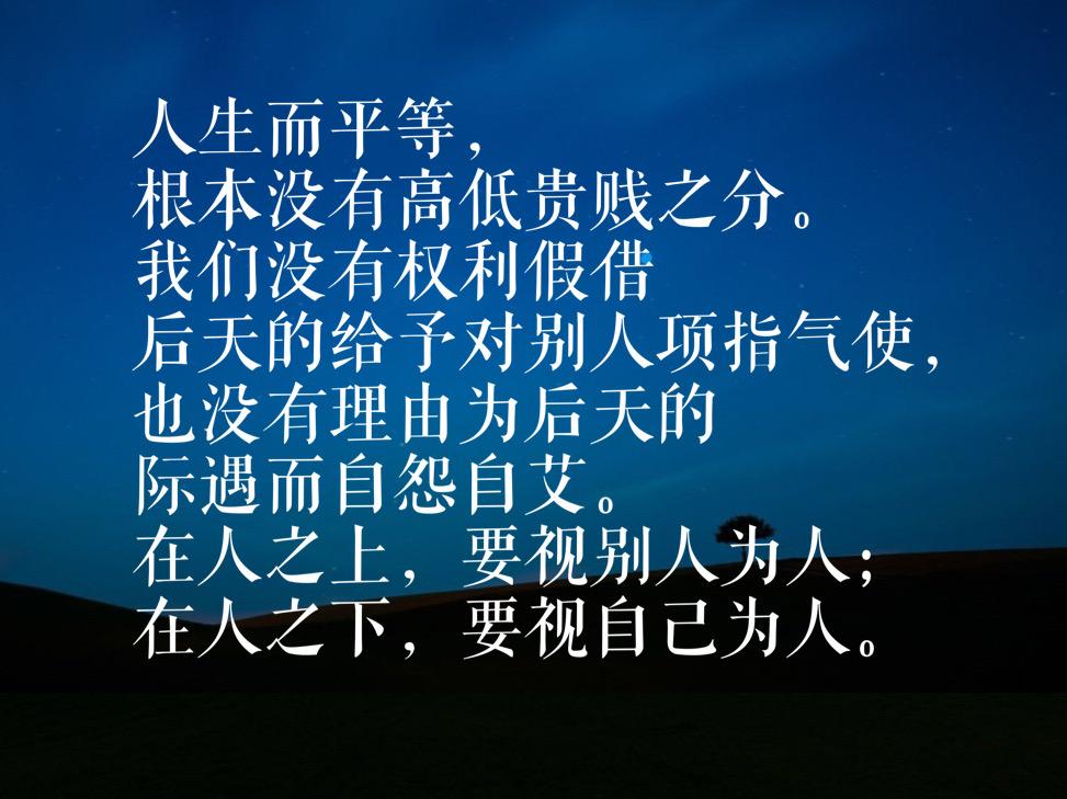 人生而平等,根本没有高低贵贱之分。我们没有权利假借后天的给予对别人项指气使,也没有理由为后天的际遇而自怨自艾。在人之上,要视别人为人;在人之下,要视自己为人。