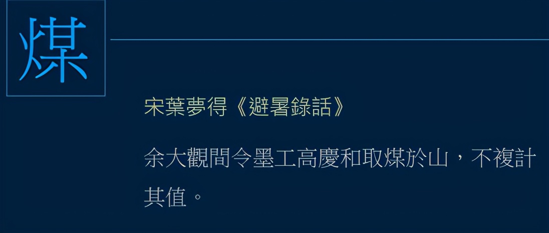 「煤」,《说文解字》不收,也是后起字。「煤」的意思是烧烟后剩下的灰,如煤灰,煤炱,古时在炉灶、烟囱、锅底,都可以收集到煤灰。