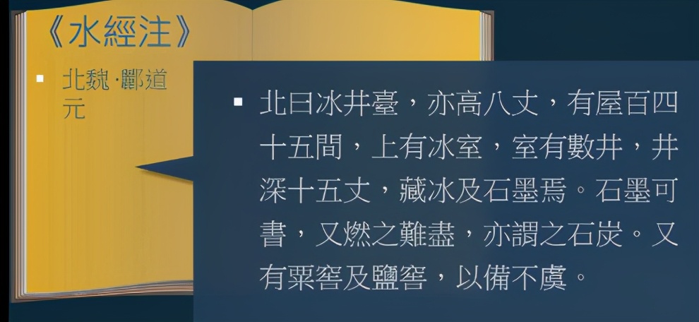 ■北曰冰井台,亦高八丈,有屋百四十五间,上有冰室,室有数井,井深十五丈,藏冰及石墨焉。石墨可书,又燃之难尽,亦谓之石炭。又有粟窖及盐窖,以备不虞。