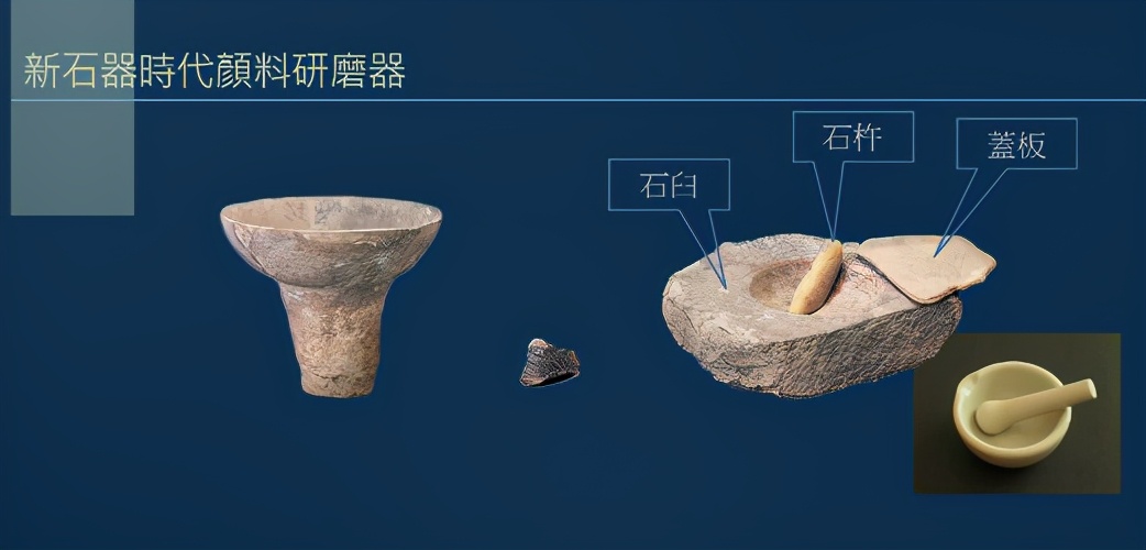 这是新石器时代后期平板颜料研磨器,表面平整,河南陜县庙底沟出土,中国国家博物馆藏。磨具上面那块黑乎乎的赤铁矿,可磨出深红色。