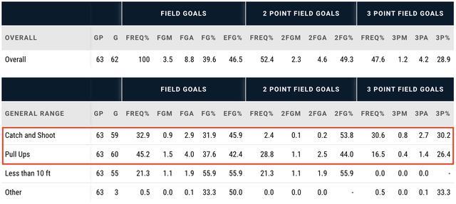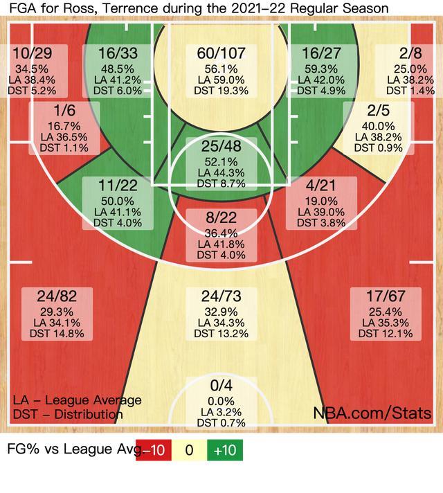 在三分命中率数据上,泰伦斯-罗斯不仅仅是仅有29.2%三分命中率,他在急停跳投的三分出手中仅能有26.4%三分命中率,接球就投的三分命中率仅有30.2%: