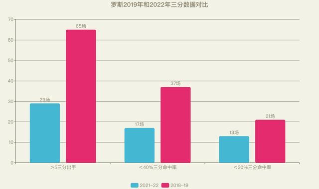 相比之下,泰伦斯-罗斯在2018-19赛季也曾有65场至少5次三分出手的比赛,37场三分命中率低于40%的比赛,21场三分命中率低于30%比赛。
