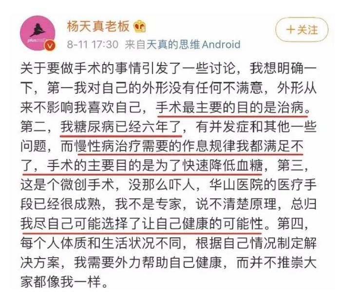 她说自己没有时间运动,也做不到节食。最终,伴随着肥胖而来的糖尿病和各种并发症,让杨天真不得不接受医学治疗,为了“最高效”的治疗效果,她选择切胃。