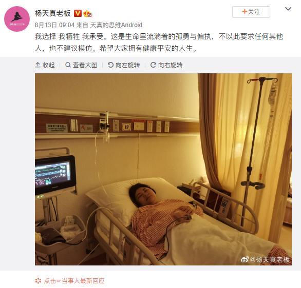 在接受了切胃手术之后,今年35岁的杨天真躺在医院的病床上,发了一条微博:“我选择,我牺牲,我承受。”