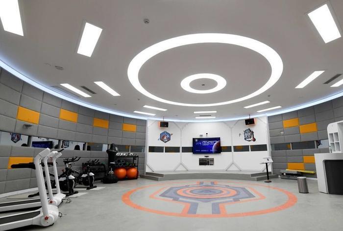 火星1号基地, 所有舱体都最大程度上还原了火星场景。中国载人航天工程航天员系统副总设计师、舱外航天服责任总设计师李潭秋将其评价为,“目前为止,该基地是中国国内最为真实的一个火星生存模拟基地”。图为一艘模拟太空舱的内部,这里是供航天员健身的地方。