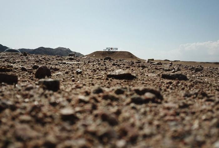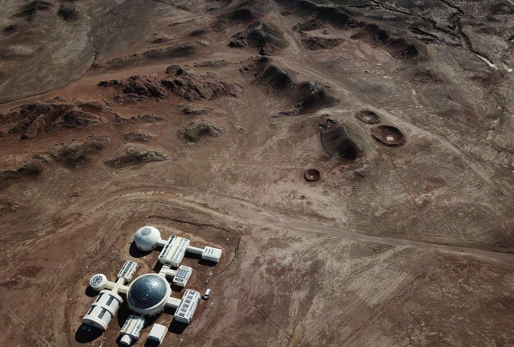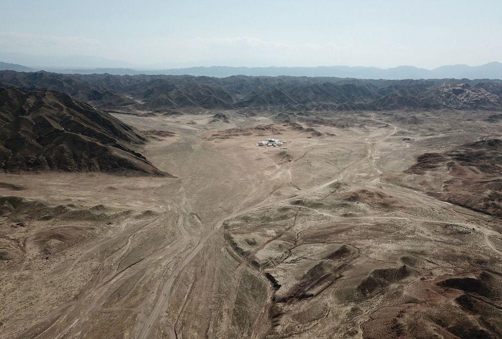 放飞无人机,从空中看这里又是另一番景象。这片荒漠,几乎寸早不生,有的只是黄土、岩石和一座座隆起的土丘和高山,像极了火星表面。而火星基地的白色在深黄的包围下格外显眼,甚至有些突兀。