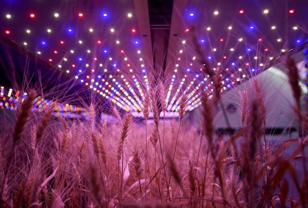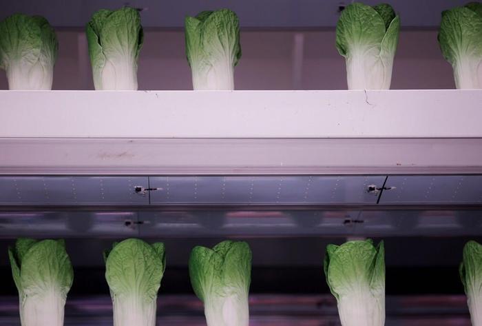 以生物舱为例,它主要模拟航天员登上火星之后,人工创造水、热、光、气等条件,培育植物和蛋白质虫,以供航天员使用。图为“火星1号基地”里,一个模拟实验室里的假蔬菜