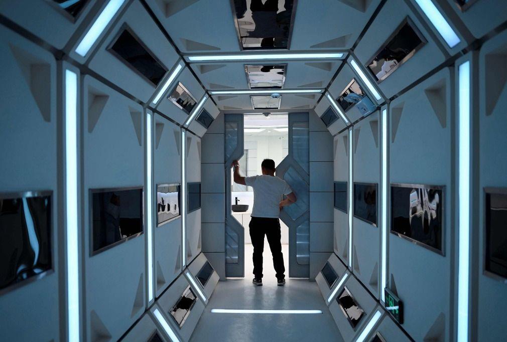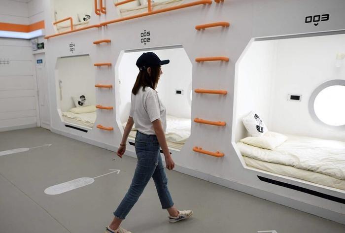 这是火星模拟基地里的沉睡太空舱。图为一名女子准备去体验一下乘员舱里宽松舒适的床。