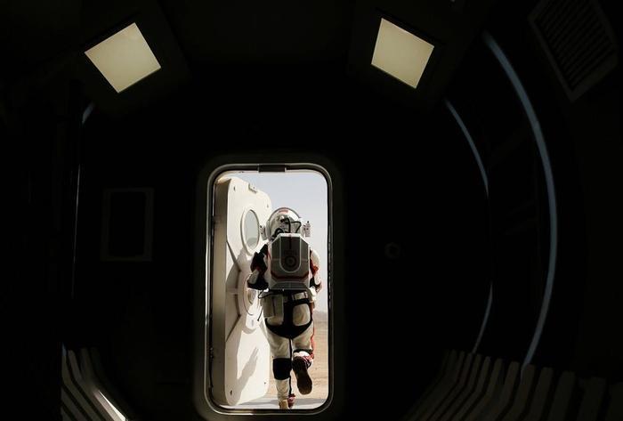 在甘肃金昌外戈壁沙漠的火星模拟基地,一名工作人员身穿模拟宇航服从总控舱走出。