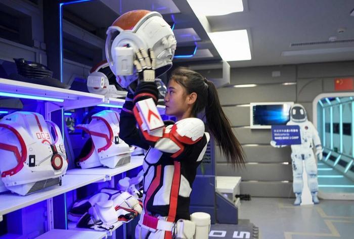 在“火星1号基地”中的火星模拟生存基地,工作人员向学生科技爱好者介绍“太空服”。