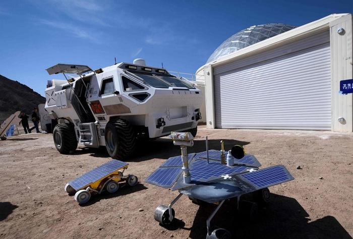 据悉,这个基地是目前为止,最为真实的一个火星生存仿真基地,结合周边独特的地形地貌来进行航天科普活动。据报,未来建起中国首个航天地外生存实训基地后,或会真正地将其应用到探月、探火任务以及科学实验中。这个项目对甘肃、乃至中国的航天科普教育,提供了独特的实景体验基地,也是重要的科普平台。图为在“火星基地1号”上可以看到火星漫游者的模型。