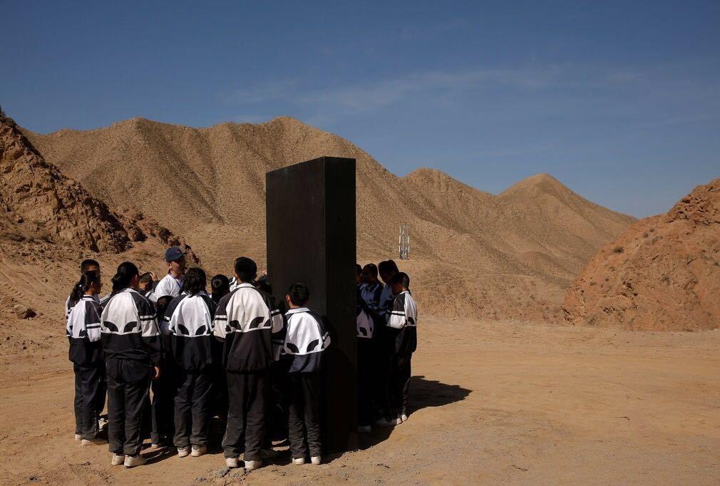 根据真实航天逻辑打造的“火星1号基地”4月17日在中国甘肃省金昌市正式开营,来自金昌市金川区总校二中初一年级的100多名学生,成了首批营员,他们在基地专业人士指引下,完成“火星徒步”、“观察火星洞穴”、体验登陆舱等体验活动, 率先体验了“火星”生活。图为在“火星1号基地” 外,工作人员正在为学生们讲解一块代表火星物质的黑色平板。