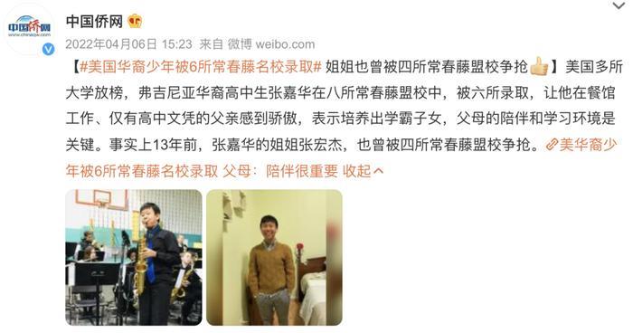 “华裔少年被6所常春藤名校录取”。