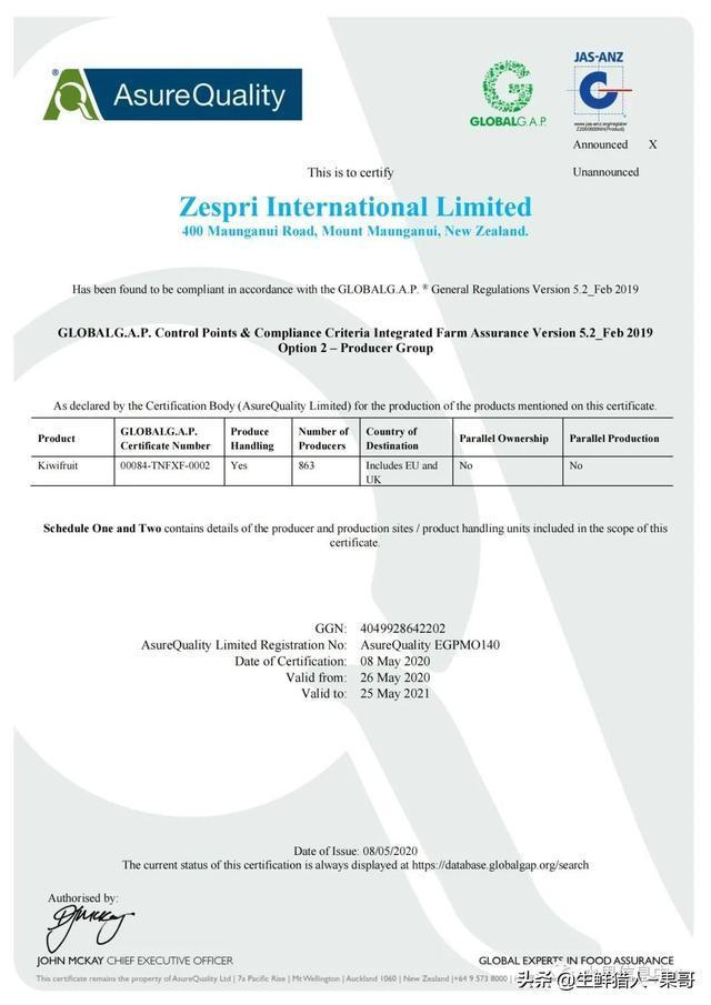 栽种:因奇异果本身比较脆弱,果园旁都会建立高耸的“防风林”来抵挡强风保护奇异果,另外,会用纱网来避免冰雹等天然灾害。当地肥沃的火山土壤及充足的降雨量与日照皆是果园需具备的。所有想要出口水果的种植者必须通过GLOBALG.A.P.认证。