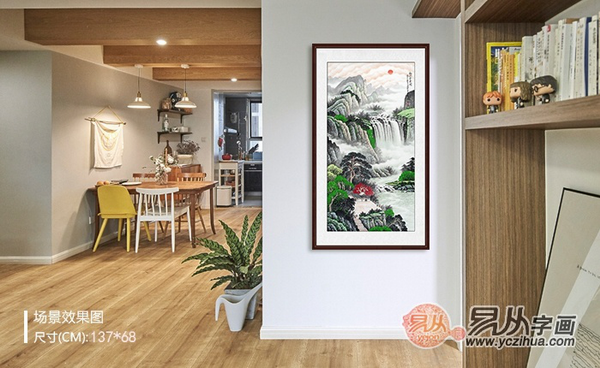 此幅山水画描绘的一幅春天的万物复苏的美景,绿树红花,一种生机盎然的春意美景展现在我们的面前,飞流而下的瀑布激起云雾,让本就如梦幻般的田园生活更显得诗意浓郁,绿色本就能够使人视野开阔,山载德,君子当厚物载德,水为善,水利万物而不争,山水是人们一种都喜欢的对象,忘情山水,感悟自然,人们在自然山水面前才能得到最极致的放松,所以这幅极具生机的山水画挂在家中更显客厅开阔,也能够缓解客厅中枯燥乏味的环境,给人一种自然清新的至美感觉。