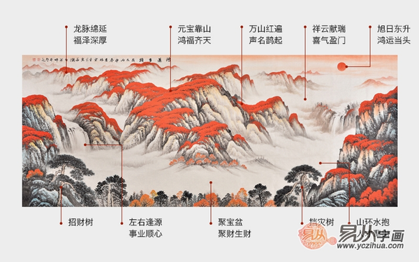 在风水上:秋山万里,万山红遍,层林尽染,气势磅礴,意境寥廓。宏火巨制,匠心独运,寓意吉祥,“鸿运千秋”可寓国运兴旺昌隆,福泽千秋万代, 又可意家道运势,聚福纳财,百代兴旺,薪火相传,前有财路,后有靠山,万山红遍,声名鹊起,客厅挂画的佳选!