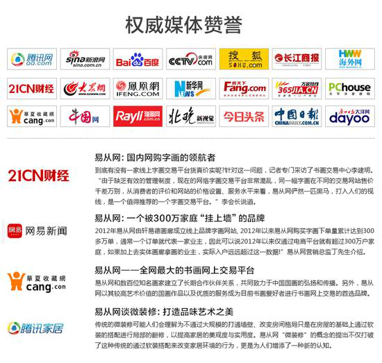 一直是国内有权威,有影响力的名家字画网站。是众多字画爱好者以及藏者朋友购买字画的最佳平台,并多次被多家新闻媒体报道宣扬。