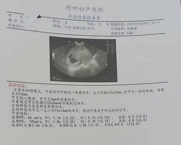 最近一次检查,宝宝已经有了胎心胎芽~正在稳定的成长,恭喜~