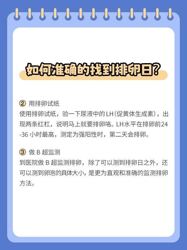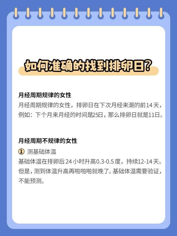 如何准确的找到排卵日? [胜利]月经周期规律的女性 月经周期规律的女性,排卵日在下次月经来潮的前14天,例如:下个月来月经的时间是25日,那么排卵日就是11日。 [胜利]月经周期不规律的女性 1️⃣测基础体温 基础体温在排卵后24小时升高0.3-0.5度,持续12-14天。 但是,测到体温升高再啪啪啪就晚了。基础体温需要验证,不能预测。 2️⃣用排卵试纸 使用排卵试纸,验一下尿液中的LH(促黄体生成素),出现两条红杠,说明马上就要排卵咯。LH水平在排卵前24 -36 小时最高,测定为强阳性时,第二天会排卵。 3️⃣做B超监测 到医院做B 超监测排卵,除了可以测到排卵日之外,还可以测到卵泡的具体大小,是更为直观和准确的监测排卵方法。