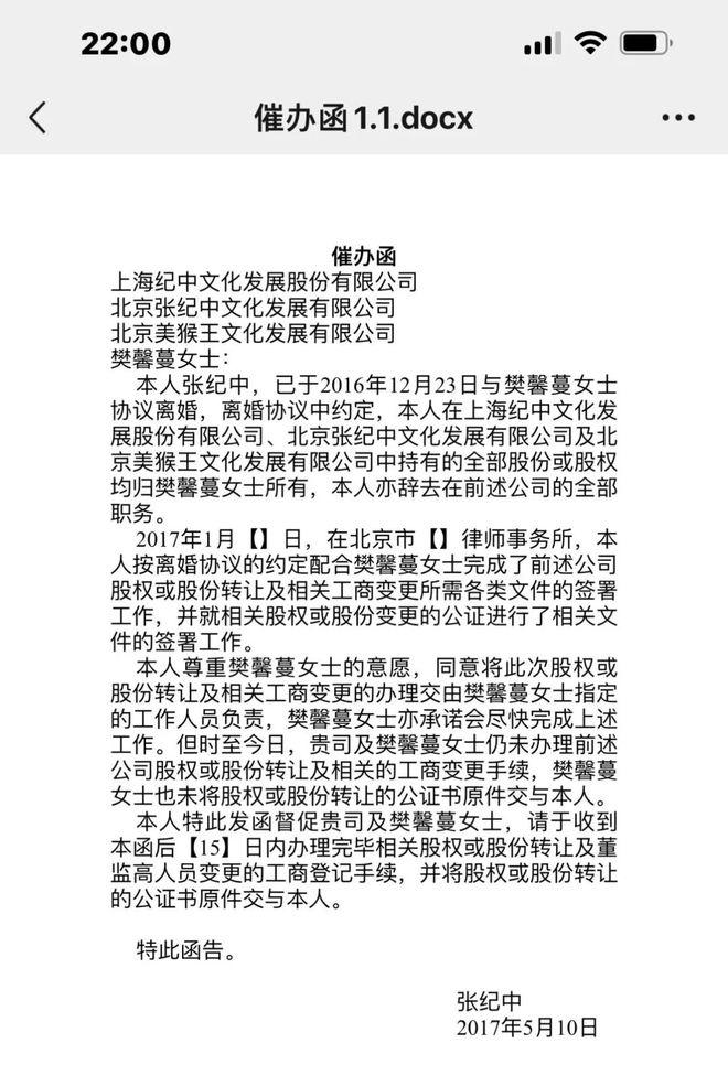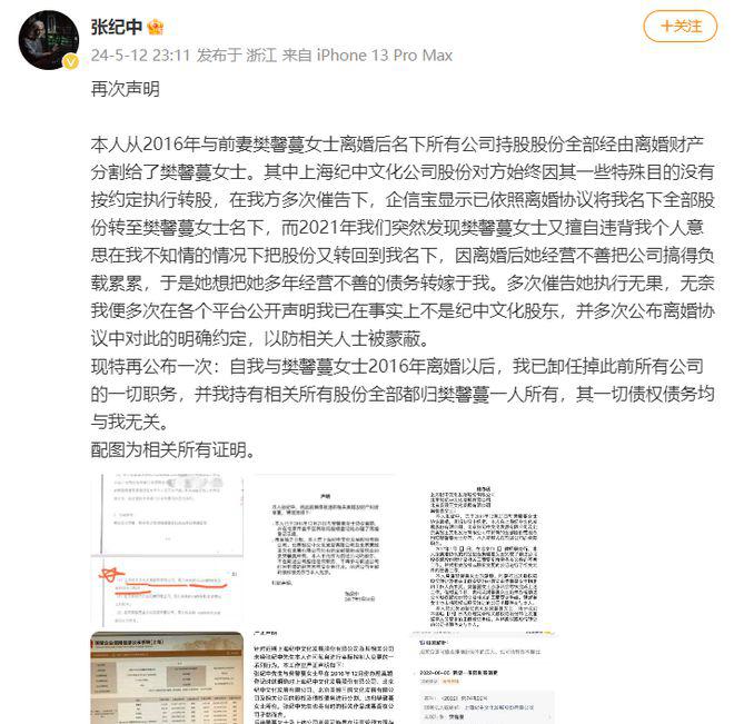 而在今年 5 月 12 日,张纪中曾发微博表示,"离婚后名下所有公司持股股份全部经由离婚财产分割给了樊馨蔓女士。其中上海纪中文化公司股份对方始终因其一些特殊目的没有按约定执行转股,在我方多次催告下,企信宝显示已依照离婚协议将我名下全部股份转至樊馨蔓女士名下,而 2021 年我们突然发现樊馨蔓女士又擅自违背我个人意思在我不知情的情况下把股份又转回到我名下,因离婚后她经营不善把公司搞得负载累累,于是她想把她多年经营不善的债务转嫁于我。多次催告她执行无果,无奈我便多次在各个平台公开声明我已在事实上不是纪中文化股东,并多次公布离婚协议中对此的明确约定,以防相关人士被蒙蔽。"