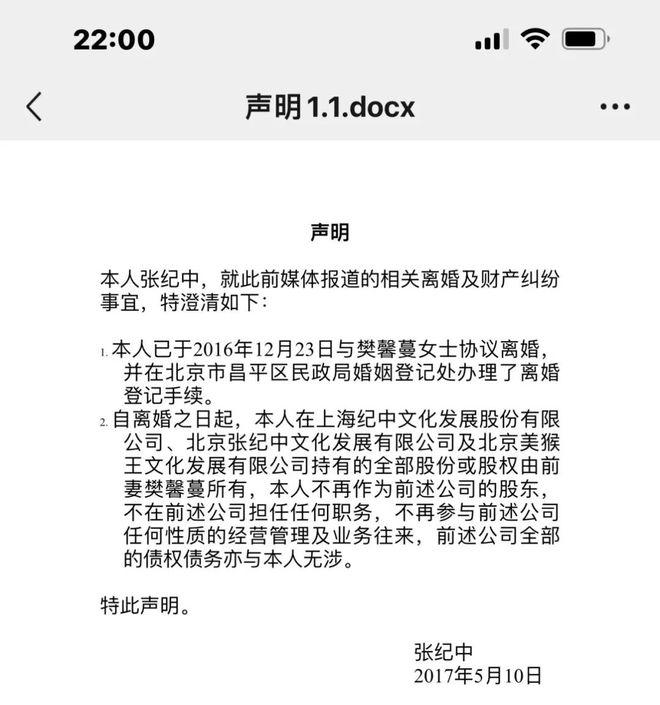 2022 年 5 月 21 日,张纪中为辩解向公司借款、还款问题,微博首次晒出张纪中和樊馨蔓的离婚协议书,其中就孩子抚养、樊馨蔓详细住址、和财产分割均有详细说明。