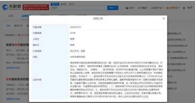 天眼查 App 显示,近日,因张纪中未履行致歉义务,北京互联网法院公告樊馨蔓(张纪中前妻)与其网络侵权责任纠纷案件判决书主要内容。