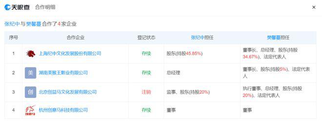 公开资料显示,张纪中与前妻樊馨蔓当前仍在上海纪中文化发展股份有限公司、湖南美猴王影业有限公司等存在合作关系。