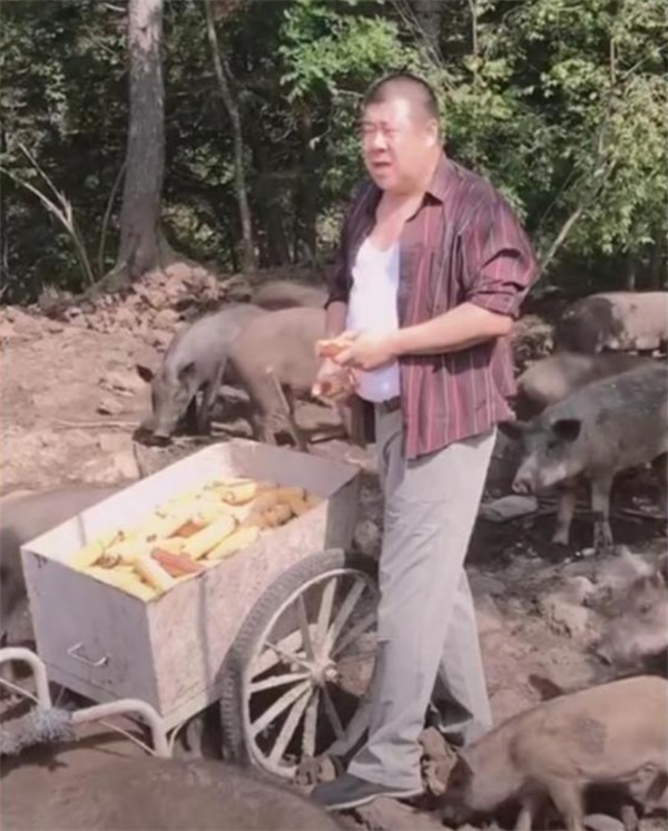 在他晒出的短视频中,他穿着一身非常朴素的衣服,推着一辆小斗车,正在耐心地掰着玉米喂小猪。
