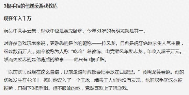 而拉风龙的童年更是相当黑暗,在他4岁的时候,由于误入了一个工地导致自己的手指被搅断了,对一个4岁的孩子来说这是一个非常致命的打击。其实身体残疾并不是主要的,心理的不自信才是残疾人最需要克服的。拉风龙自己之前也说过这件事,以前并没有现在这么自信,走路的时候都会把自己的手放在口袋里,生怕被别人看到。但仅有三根手指的通过游戏和直播重新站了起来。