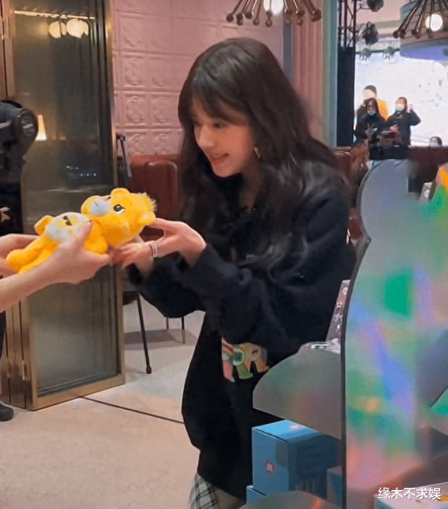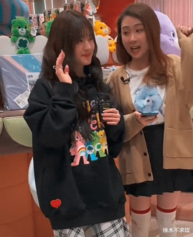 那天赵露思穿着一件印有卡通图案的黑色卫衣,下身搭配着格纹裙,非常休闲随性。她的发型和妆容与着装相得益彰,卷发配齐刘海,妆容清淡甜美,给人亲和的感觉。虽然她是明星,但站在主持人旁边一直抿着嘴笑着挥手示意,看上去就像个邻家妹妹一样可爱又乖巧。尽管赵露思的身高只有161cm,但在低跟靴的加持下,她的个子显得不那么娇小,完全符合“萌妹”的形象。